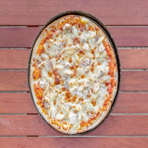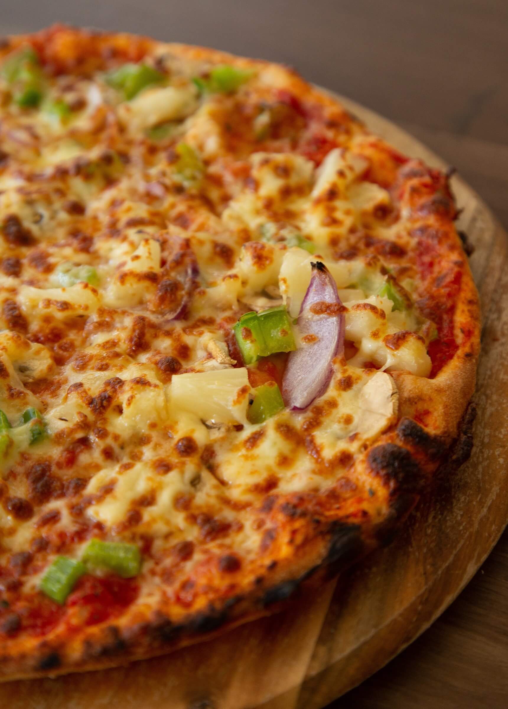 Tomato, cheese, caramelised onion, chicken, pineapple and barbeque sauce